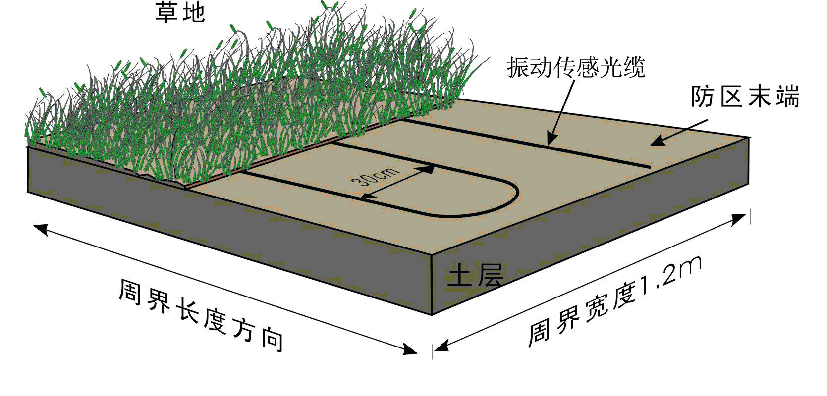在沙土地下埋設振動傳感光纜時,也採用平行鋪設多道振動傳感光纜的鋪設方式,但由於沙土比較松軟,當入侵者進入該區域時,透過沙土層對振動傳感光纜施加壓力 ,振動傳感光纜可探測到微小的擠壓變形並産生信号,所以在沙土地埋設振動傳感光纜時 ,應減少平行振動傳感光纜的間距,而且埋設不可過深。通常採用的間隔爲20--25cm,埋設深度爲5--10cm,如圖。在進行施工時,首先在需要鋪設光纜的區域挖出一道寬1.2m,深10cm的凹槽,在凹槽的底部平鋪一層厚度爲3cm的粗沙,再将振動傳感光纜平行鋪設於粗沙表面,每隔50cm用鋼絲線卡子固定。光纜鋪設完成後,在其上面覆蓋一層厚度爲5cm的粗沙,最後在其表面均勻地覆蓋一層1--2cm的地表介質(細沙或松散幹燥的泥土)。